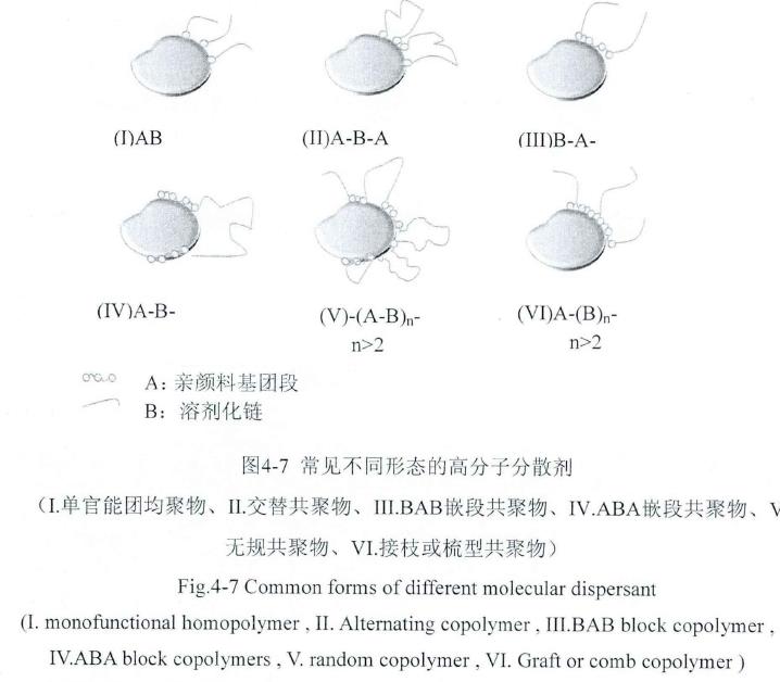 如圖可見,型高分子分散劑即為單點鋪固,其他幾乎都是多點錨固,一般多點鋪固與顆粒之間的結合力要明顯強于單點描固與之的結合力,所以帶有多點鋪固基團的分散劑比單點貓固分散劑具有更好的的分散穩(wěn)定性,分散劑的吸附形式主要有種尾形、環(huán)形、臥形,等人經過理論推導預言尾形和環(huán)形更有利于空間穩(wěn)定。同時為了使分散劑對顏料粒子在溶液體系中的分散具有足夠的空間穩(wěn)定作用,其溶劑化鏈段應在分散介質能得到足夠伸展的構象,所以分散劑選擇一般根據粉體、溶劑體系等性質為依靠。