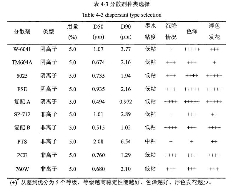 好分散劑是一種陰離子型高分子混合物,可用于水性油性體系,它在浮色發(fā)花的處理上效果很好,但是分散性能一般,常作為潤濕流平劑使用;復配分散劑是一種陰離子型嵌段共聚物分散劑,不含,用于分散無機顏料,制備高濃度低粘度的色獎,儲存穩(wěn)定性好,但是對于分散特黑顏料,分散效果較差;分散劑、復配、分別為嵌段共聚的潤濕型有機娃溶液、非離子型帶有特殊親顏料基團的嵌段聚合物型分散劑、非離子型帶有芳香基團高分子無規(guī)聚合物,根據實驗c現,達到最佳分散狀態(tài)下,與陰離子分散劑相比,復配分散劑的用量較高;分散劑對于分散有機顏料效果極佳,但是分散無機顏料,用量較大,且粘度較高,不適合用于分