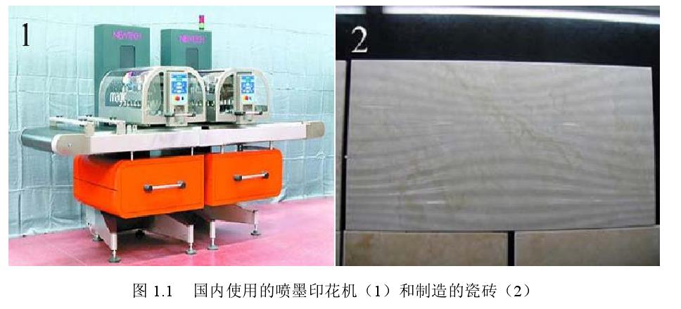 100%邊緣到邊緣的打印,高質量的噴墨打印機的噴嘴即使在灰塵較多的環境中也照樣可以打印出良好的圖案效果。意大利 Newtech 數碼彩色噴墨印花機噴墨分辨率高達 360dpi,噴頭可噴出 7 種大小尺寸的墨點進行級配打印,其墨水利用率達到 98%,圖 1.1 是國內某企業進口的意大利 Newteck 公司生產的keramagic350 數碼噴墨印花機噴墨印花機和用該設備制造的瓷磚。該設備的是參數為:解析度:360dpi,印花速度:25m,印花總類:標致 4 色印花,灰色等級:8 個等級,印花總類:標準 4 色印花,生產出的瓷磚色彩逼真,圖形分辨率高,紋理細膩,具有很高的觀賞價值。意大利 Sertam 公司的 Pink 系列噴墨陶瓷涂飾機,分辨率可高達 720dpi,任何凹凸不平的表面都可以進行噴墨,Sicer 數字墨水質量優良。福祿(FERRO)在歐洲陶瓷噴印墨水方面占有 60-70%的市場,目前可以做到 10 個顏色。