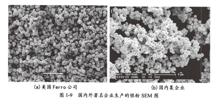 銀粉制備方法大致可分為物理法和化學法。工業上主要以化學液相還原法為主,它是工業上最常用的方法,因該工藝流程簡便可行、生產成本低、規模大等優點,化學液相還原法在電子工業領域得到了非常廣泛的應用。化學液相還原法工藝參數主要有反應物濃度、還原劑種類、表面活性劑種類、溶液pH值、溫度、攪拌速度、滴液速度,在工業生產中須嚴格控制各影響參數。常見的還原劑有水合肼、抗壞血酸、乙二醇和N,N.二甲基甲酰胺等。常見的分散劑有聚乙烯吡咯烷酮、十二烷基硫酸鈉、聚乙二醇等。物理法主要為機械球磨法,吳海斌等,采用機械球磨法制備了片狀銀粉,該法制備的銀粉分散性和加工性能良好,性能穩定,可供電子元件生產時使用。目前,國外對于太陽能電池用導電銀粉的研究已趨于成熟,制得的銀粉分散性好,振實密度高,如圖1.9(a)。而國內所制銀粉不僅分散性不佳,其振實密度也不算高,如圖,銀粉性能的落后嚴重影響了國內正面銀漿產業化的進程,國內銀粉技術還有待進一步探究和提高,以滿足正面銀漿的國產化需求。