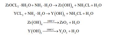 包含一種或多種離子的可溶性鹽溶液,當(dāng)加入沉淀劑(如 1 OH? , 2 C O2 4 ? , 2 CO3 ? 等)后,或于一定溫度 下使溶液發(fā)生水解,形成不溶性的氫氧化物、水合氧化物或鹽類從溶液中析出,并將溶劑和溶液中原有 的陰離子洗去,經(jīng)熱分解或脫水即得到所需的氧化物粉料。該方法可分為共沉淀法、均勻沉淀法[3]和多 元醇沉淀法。其中共沉淀法又可分為單相共沉淀法[4]和混合物共沉淀法[5]。 以 ZrOCL2?8H2O 為基體溶解于去離子水中,達(dá)到飽和狀態(tài),溶好后的溶液通過 320 目的尼龍濾網(wǎng), 過濾掉 ZrOCL2?8H2O 中的雜質(zhì),根據(jù)需要制造的氧化鋯品種確定 YCL3 的數(shù)量(不同 YCL3加入量可制造 出 3Y,5Y,8Y 等不同穩(wěn)定性的氧化鋯)。 氯化釔選用分析純試劑,YCL3 溶解于溫水中,將 ZrOCL2?8H2O 和 YCL3 的混合溶液置于反應(yīng)器中, 用攪拌機勻速攪拌,直至兩種液體充分融合,再用霧化器將 NH3?H2O 霧化并噴入反應(yīng)器中,使 ZrOCL2?8H2O 和 YCL3 混合液在反應(yīng)器中迅速反應(yīng),形成沉淀 Zr(OH)4 和 Y(OH)3。通過攪拌機勻速攪拌, 使 Zr(OH)4 和 Y(OH)3 混合均勻。 反應(yīng)剛開始時由于生成沉淀物較多,攪拌較為困難,可適當(dāng)降低攪拌機轉(zhuǎn)速,提高攪拌機功率,隨 著攪拌的持續(xù)進行,混合原料會很好的懸浮于液體中,保持連續(xù)攪拌 30 分鐘以上,直至混合的懸濁液達(dá) 到細(xì)膩的粥狀,這樣可使氧化釔在后續(xù)的物相反應(yīng)中更好的與氧化鋯形成穩(wěn)定的立方相或四方相,從而 達(dá)到穩(wěn)定氧化鋯的目的。 反應(yīng)完成后,將反應(yīng)后的物料加入高速離心機脫水、脫氯。其中脫氯過程相對比較困難,需多次反 復(fù)加入去離子水沖洗,并通過高速離心機脫水。對高速離心機甩出的水分采用硝酸銀溶液(稀硝酸酸化) 檢測,如有白色沉淀產(chǎn)生,說明氯離子未完全脫掉,需繼續(xù)加入去離子水沖洗,直到檢測中沒有白色沉 淀產(chǎn)生為止。