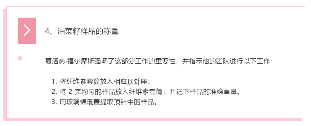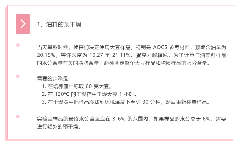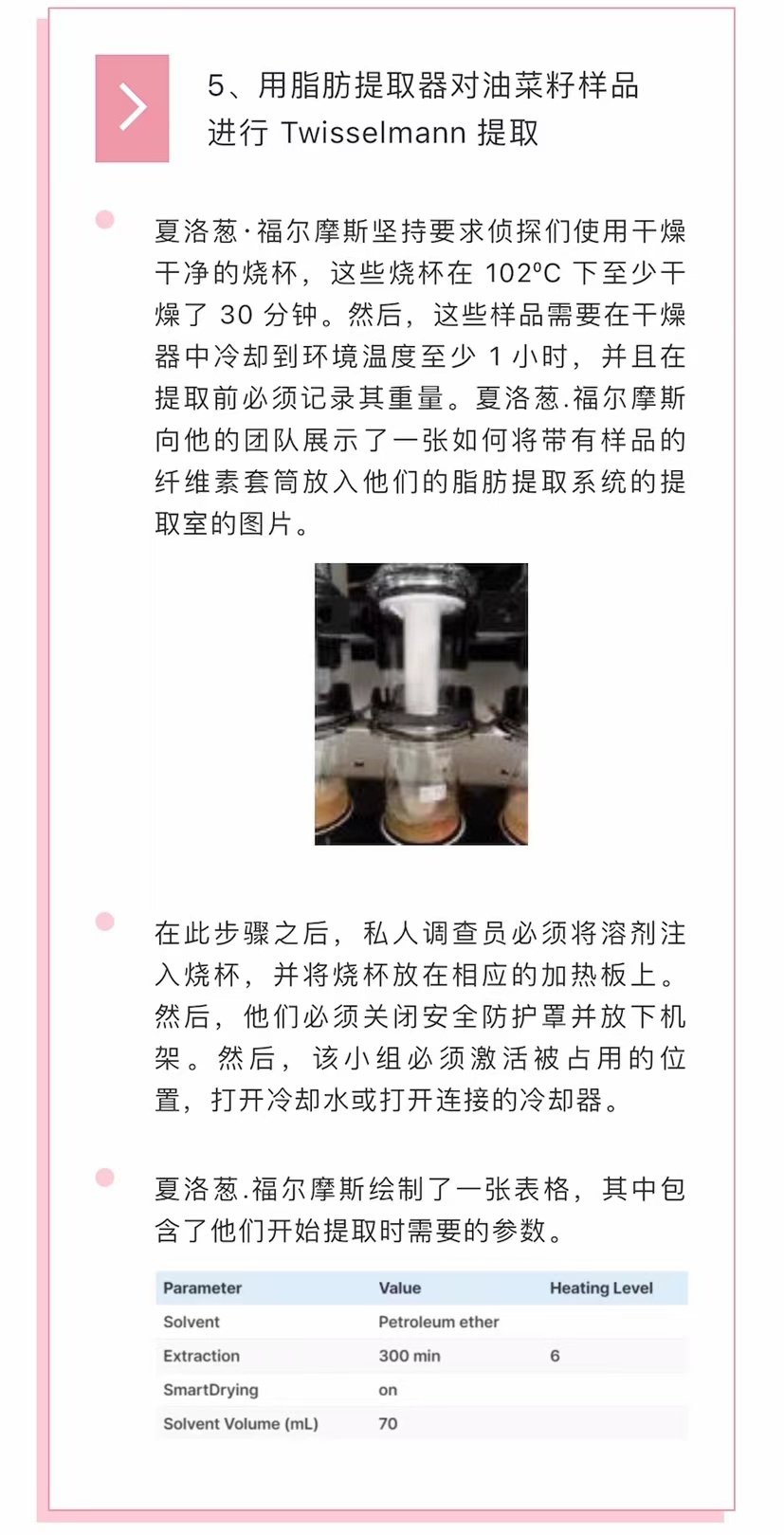 夏洛蔥·福爾摩斯提出,他們通過標(biāo)準(zhǔn)方法 AOCS Ac 3-44 的步驟,偵探們將使用該方法進(jìn)行實(shí)驗(yàn),以滿足合規(guī)性要求。偵探們討論了每一個步驟,以優(yōu)化油菜籽中油的測定過程。