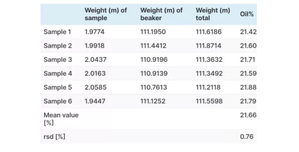 他們一起看了他們的結(jié)果,并注意到數(shù)據(jù)與預(yù)期值非常吻合,相對標(biāo)準(zhǔn)偏差很低(預(yù)期含油量:20.19%,容許極限為19.27-21.11%)。
