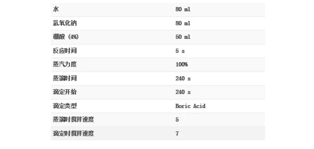 食品偵探們使用蒸汽蒸餾裝置進行凱氏定氮分析,使用以下參數進行蒸餾: