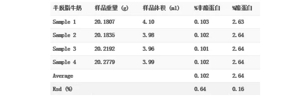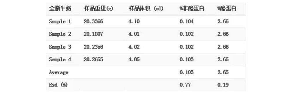 其中,樣品的平均空白體積為0.298 ml(n=4),測得的總氮含量為0.519%,以此來計算酪蛋白含量。