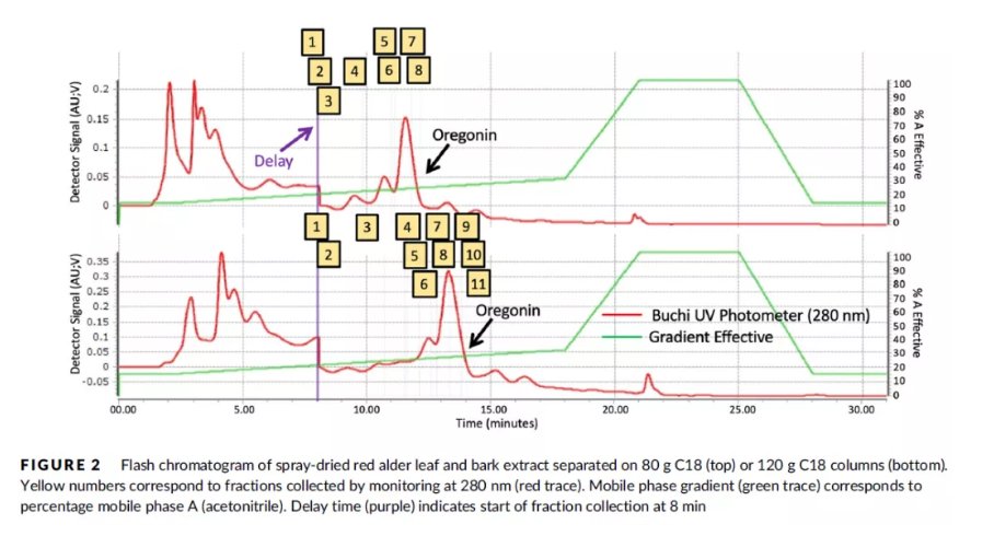 應用文獻來源:Efficient purification of the diarylheptanoid oregonin from red alder (Alnus rubra) leaves and bark combining aqueous extraction, spray drying and flash-chromatography