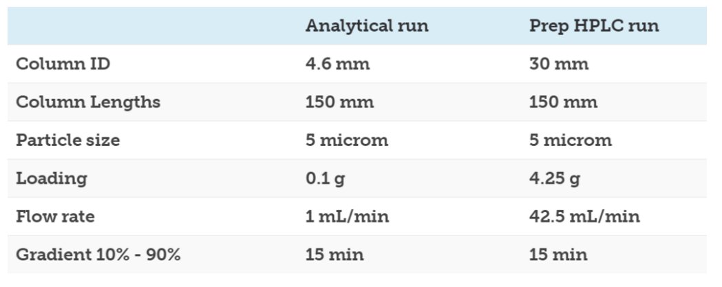 一旦您對分析結果感到滿意,您可以考慮直接運用制備型 HPLC 進行大量制備了。用戶喜歡分析色譜的另外一個原因是,可以借助一些公式直接將分析色譜的方法轉移到制備色譜上。