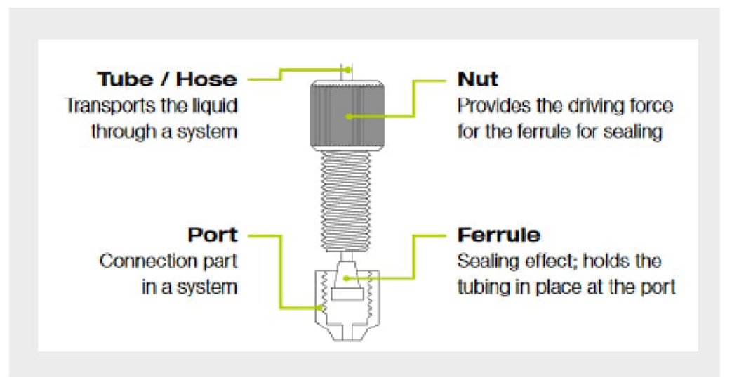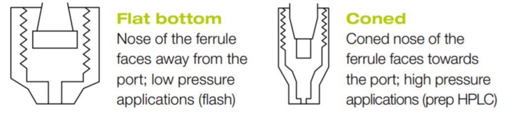 平底卡套適用于低壓應用,如中壓制備色譜。它們不是永久性地連接到管子上,而且卡套的尖端面向螺母。錐形卡套更適合于高壓應用,如高壓制備色譜。這些類型的卡套一旦被緊固就會變形并固定在管子上,卡套的尖端遠離螺母。