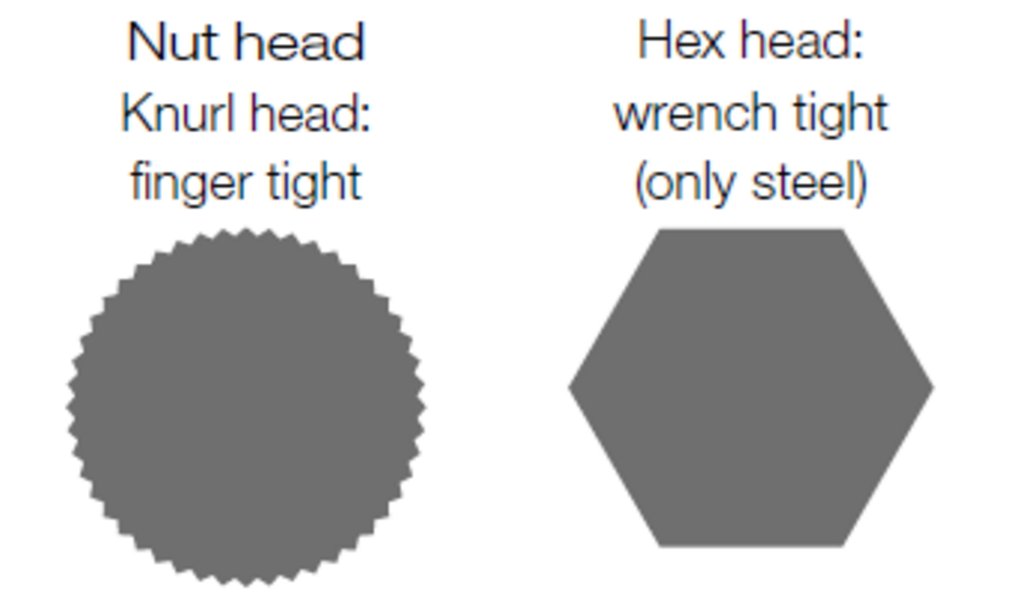 螺母頭可以是滾花頭(Knurl),需要用手指擰緊,也可以是六角頭(Hex),通常只由鋼制成,需要用扳手擰緊。