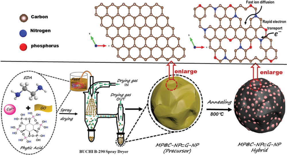 具有精確控制工程的過(guò)渡金屬磷化物(TMP)材料的微/納米結(jié)構(gòu)調(diào)控的新型合成方法的發(fā)展對(duì)于實(shí)現(xiàn)其在電池中的實(shí)際應(yīng)用至關(guān)重要。本研究采用噴霧干燥技術(shù)構(gòu)建了三維(3D)N,P 共摻雜石墨烯(G-NP)微球,微球內(nèi)嵌 CoP@C 和 MoP@C 兩種核-殼型納米粒子(CoP@C ? G-NP, MoP@C ? G-NP)。