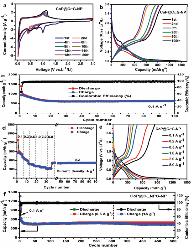 因此,CoP@C ? G-NP 和 MoP@C ? G-NP 復(fù)合材料在 0.1 A g-1 的電流密度下具有 823.6 和 602.9 mAh g-1 的高比容量;在 1 A g-1 下,500 次和 800 次循環(huán)后,比容量為 438 和 301mAh g-1,表現(xiàn)出及其出色的循環(huán)穩(wěn)定性。