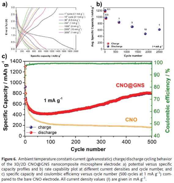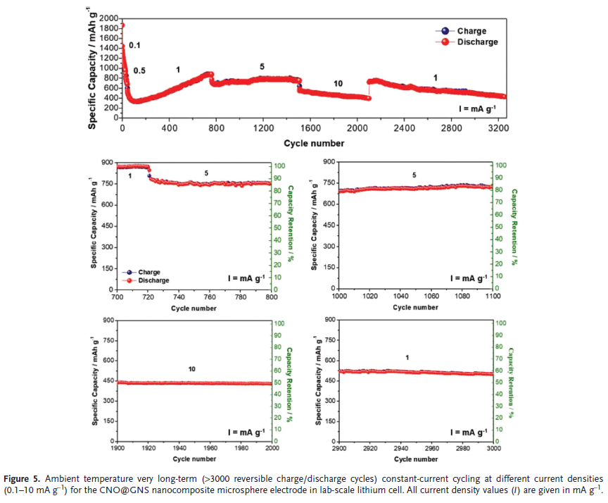 它們表現(xiàn)出前所未有的電化學(xué)行為,如高可逆比容量(在低 0.1 mA g-1 下的初始放電容量超過(guò) 1700 mAh g-1; 在 1 和 5 mA g-1 下,800 次和 1300 次循環(huán)后,比容量為 850 和 730 mAh g-1;在超過(guò) 2000 次循環(huán) 10 mA g-1 的非常高的電流密度下,比容量仍高于 400 mAh g-1),出色的庫(kù)倫效率和長(zhǎng)期穩(wěn)定性(超過(guò) 3000 次循環(huán),容量保持率>55%)。與通過(guò)傳統(tǒng)技術(shù)制備的大多數(shù)過(guò)渡金屬氧化物和納米復(fù)合材料相比,其在高電流密度下是顯著的。