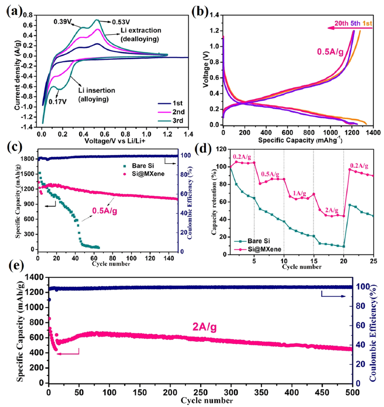 這兩個(gè)因素都穩(wěn)定了電極結(jié)構(gòu)。此外,在充放電循環(huán)時(shí), MXene 納米片上豐富的氟/F封端基團(tuán)有助于在框架外原位形成高度緊湊、耐用且機(jī)械堅(jiān)固的富含 LiF 的電解質(zhì)界面(SEI)層,這不僅抑制了 Si 和有機(jī)電解質(zhì)之間的副反應(yīng),還增強(qiáng)了 MXene 框架的結(jié)構(gòu)穩(wěn)定性。