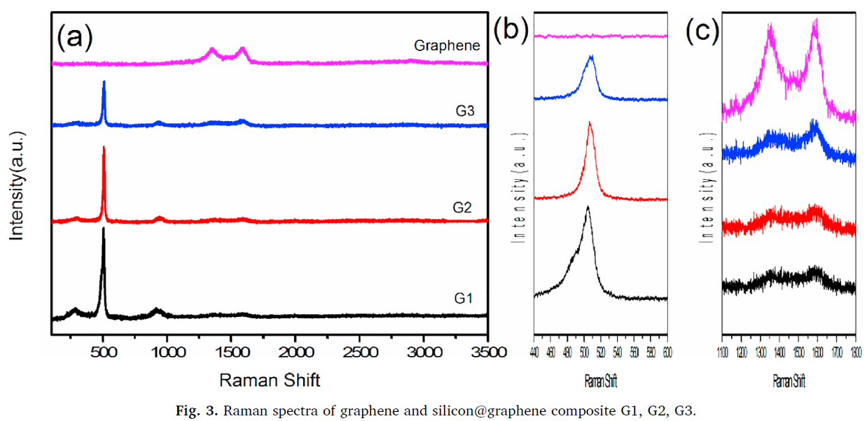 本文采用噴霧干燥法(進(jìn)、出口溫度分別為 160℃ 和 110℃)結(jié)合低溫還原技術(shù)制備了硅@石墨烯復(fù)合材料作為負(fù)極材料。通過(guò)改進(jìn)的 Hummers 方法合成了氧化石墨烯材料,并超聲波處理將氧化石墨烯粉末分散到 5% 的乙醇溶液中。并在劇烈攪拌下將納米硅粉末均勻地分散到氧化石墨烯懸浮液中形成硅@石墨烯復(fù)合材料。XRD 結(jié)果表明復(fù)合材料由硅和石墨烯組成,并經(jīng) FT-IR 和拉曼光譜驗(yàn)證。