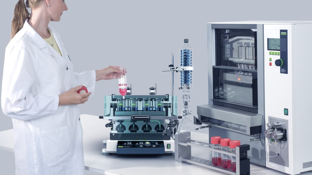 步琦的平行蒸發儀器以兩種配置提供同步處理樣品解決方案:作為分析前的步驟,平行濃縮儀 SyncorePlus Analyst 可將樣品蒸發到指定的體積(0.3 mL、1.0 mL、3.0 mL等)。平行濃縮儀 SyncorePlus Polyvap 使樣品處理量達到最高,最多可以同時處理 96 個樣品。