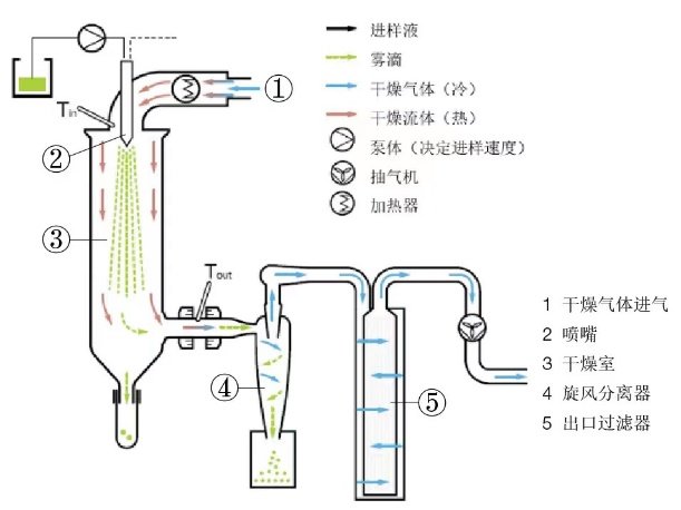 噴霧干燥是物料干燥和粉體制備的常用方法。液體漿料在噴嘴處霧化成極細的霧滴,極大增加了水分表面積,細小霧滴與熱空氣接觸過程中水分迅速汽化,使物料中固體物質干燥成粉末,即得到干燥產品。使用實驗級別噴霧干燥儀,一般液滴干燥成粉末僅需要幾秒鐘的時間;并且能直接使溶液、乳濁液、分散液干燥成粉狀或顆粒狀制品,可省去蒸發、粉碎等工序。