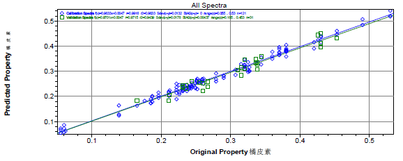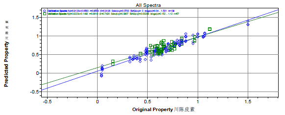 最終三種黃酮成分模型對獨立驗證集樣品預測的均方根誤差分別為 0.284,0.054 和 0.014。與傳統分析方法 HPLC 相比,近紅外分析操作簡便,快速無損,結果準確,且能夠多組分同時測量,這對陳皮藥材的質量控制及在線監測等方面,都有極高的應用價值。