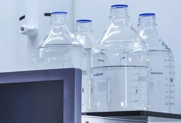 ▲ 放置于 Pure 儀器頂部托盤內的流動相