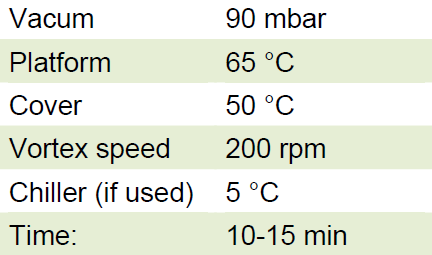 經(jīng)過 SPE 模塊步驟之后,洗脫的黃綠色餾分直接用 Syncoreplus 蒸發(fā)濃縮到一定的體積,參數(shù)設(shè)置見下表: