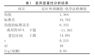 模型的驗證結果可以看出,大曲糖化力近紅外模型預測值的平均相對誤差為 5.27 %,說明該近紅外模型有較好的預測能力。為考察兩種方法檢測結果之間的差異性,采用 SPSS 軟件對 50 組大曲樣品進行差異顯著性分析。結果見下表。
