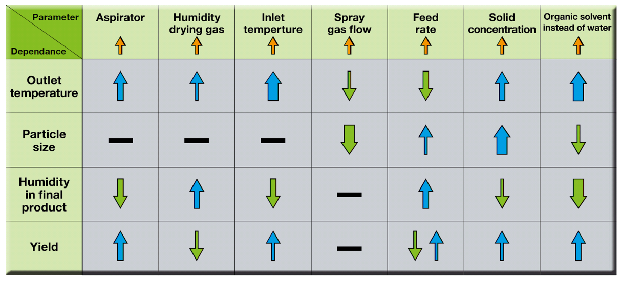 在噴霧干燥過程中,可以調整一系列參數用以控制干燥過程和最終的顆粒特性。噴干過程中重要參數包括入口溫度和出口溫度,霧化氣體流速,料液流速,料液粘度和液體中物料的性質。入口溫度和出口溫度是物料功能性過程監控解決方案的重要參數,有相關研究表明入口和出口溫度之間的比率會影響形成顆粒的特性以及回收率;干燥氣流對顆粒特性似乎沒有任何直接影響,但在操作過程中還是建議使用最大流速,因為它會影響入口溫度和出口溫度。
