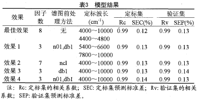 利用定標(biāo)軟件 NIRCal5.4 對(duì)采集的光譜數(shù)據(jù)進(jìn)行處理。所得光譜經(jīng) 4 種歸一化方法(趨近歸一化、最大歸 一化、0-1 間歸一化、單位長(zhǎng)度歸一化)、一階導(dǎo)數(shù)、二階導(dǎo)數(shù)等方法進(jìn)行單獨(dú)或組合處理,采用主成分回歸法 (PCR) 和偏最小二乘法 (PLS)2 種方法建立定標(biāo) 模型,并利用該軟件的自動(dòng)建模向?qū)Чδ軒椭玫捷^好結(jié)果。