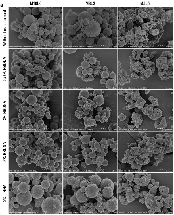 圖1 采用凝膠阻滯試驗檢測噴霧干燥后 siRNA 的結構完整性。所有三種粉體中的 siRNA 均保持完整,噴霧干燥后未觀察到降解。圖2 采用 HPLC 色譜檢測結果與凝膠阻滯測定結果一致,從噴霧干燥后造粒粉體中獲得的 siRNA 光譜和噴霧干燥前的相應料液中獲得的光譜幾乎相同(峰重疊)。圖3 通過 SEM 觀察粉體形態,無亮氨酸粉末顯示相對光滑的表面球形,隨著亮氨酸的增加,顆粒表面變粗糙,球形變差。當含有甘露醇和L-亮氨酸等質量制劑時,顆粒坍縮,失去球形。