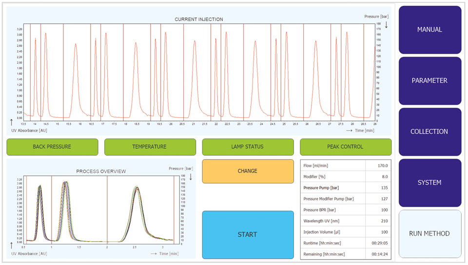 Sepiatec SFC 全系都可以進行疊層(套針)進樣,可以利用等待峰洗脫下來的時間段,連續注入額外的相同樣品。為了方便操作,軟件會自動計算和建議疊層時間。