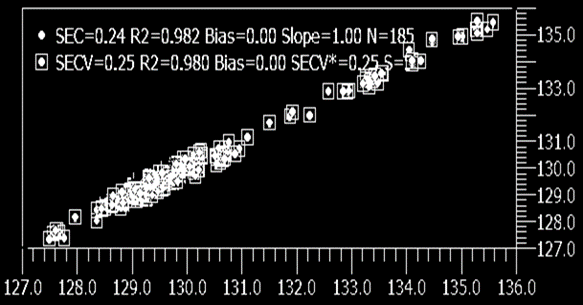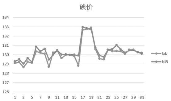 從圖中可看出碘價(jià)定標(biāo)模型的化學(xué)值和預(yù)測(cè)值有很好的相關(guān)性,驗(yàn)證集相關(guān)系數(shù)達(dá) R2 到 0.982,驗(yàn)證集偏差 SECV 為 0.25,模型具有較高的穩(wěn)定性和預(yù)測(cè)能力,預(yù)測(cè)效果如圖 3 所示。