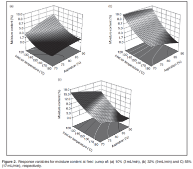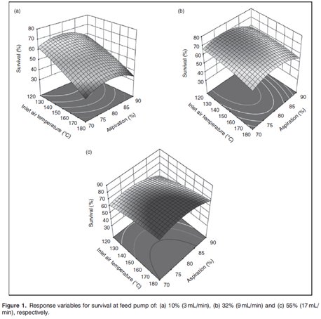 工藝探索采用響應(yīng)面法和二次復(fù)合中心設(shè)計(jì)對(duì)益生菌微囊化進(jìn)行了優(yōu)化,其自變量有進(jìn)口溫度、空氣流速和進(jìn)料流量。在最優(yōu)理論條件下進(jìn)行了三次實(shí)驗(yàn)驗(yàn)證。