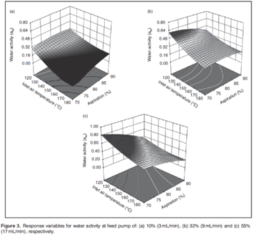 圖3 考察了水活度的響應(yīng)面變化。在較高的進(jìn)口溫度下,進(jìn)料量和氣體流量得到了較低的水活度值,因素與結(jié)果之間呈反比關(guān)系。其他使用麥芽糊精、乳清蛋白濃縮物和葡萄糖的相關(guān)研究中,水活度的值與本研究中活性最高的粉末報(bào)告結(jié)果一致。