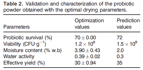 確定益生菌的包封中壁材的最佳比例對(duì)于提高微生物對(duì)抗整個(gè)胃腸道條件的穩(wěn)定性很重要。在干燥過程中指定最佳條件以最大限度地提高作為壁材的蛋白質(zhì)-海藻糖-麥芽糊精混合物的保護(hù)能力并因此提高鼠李糖的存活值也是重要的。因此,使用響應(yīng)面方法確定干燥過程的最佳條件。表2顯示了鼠李糖乳桿菌微囊化的最佳操作參數(shù),結(jié)果表明,理論模型可以很好地近似實(shí)驗(yàn)值(差異<10%)。