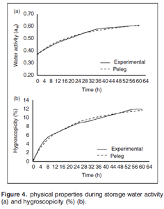 物理性質(zhì)評(píng)價(jià)如圖4所示,得到的粉末水活性動(dòng)力學(xué)顯示了較高的吸水能力,這可能是海藻糖作為低分子量碳水化合物,表現(xiàn)出的分子運(yùn)動(dòng)和擴(kuò)散效應(yīng),與用于包封基質(zhì)的典型吸水行為一致。吸濕性隨著儲(chǔ)存時(shí)間的延長有增加的趨勢,直到達(dá)到某種程度的平衡。因此加入了 WPC 來降低吸濕性,因?yàn)樗谋砻婊钚院托纬删哂休^高 Tg 膜的能力。