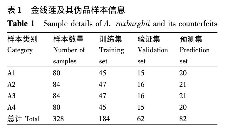 不同批次的金線蓮和銀線蓮樣品各 80 批,每批約 160 g。用于摻雜的斑葉蘭和血液蘭共計 2000g。上述樣品分次清洗 3 至 5 遍,隨后置于 60 °C 的烘箱中干燥至恒重,粉碎后過 60 目篩。經過處理后,純金線蓮和純銀線蓮樣品各 80 個,摻入斑葉蘭和摻入血葉蘭的金線蓮樣品分別有 84 個,共計 328 個樣品。