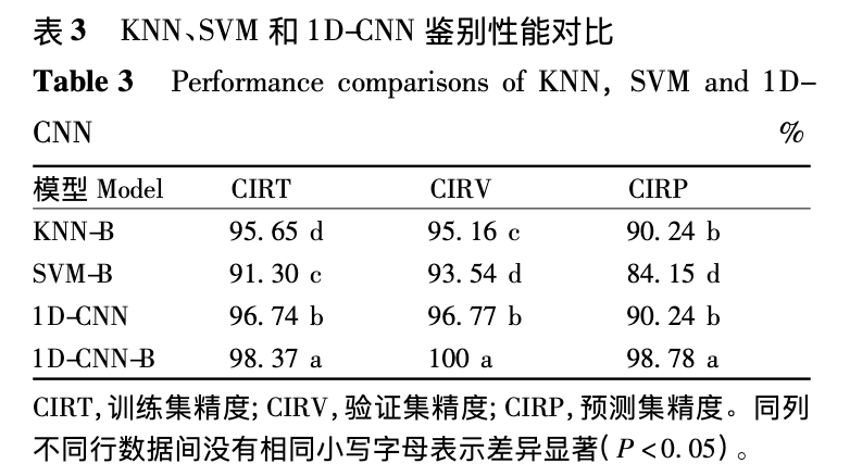 因近紅外光譜數據是序列數據,隨后采用一維卷積神經網絡(1D-CNN)對其進行特征提取,并采用貝葉斯優化算法對CNN進行參數優化。作為對比,還分別對最近鄰算法(KNN)和支持向量機(SVM)進行優化并建模驗證。最終三種算法對應最優參數模型的預測精度如下表所示: