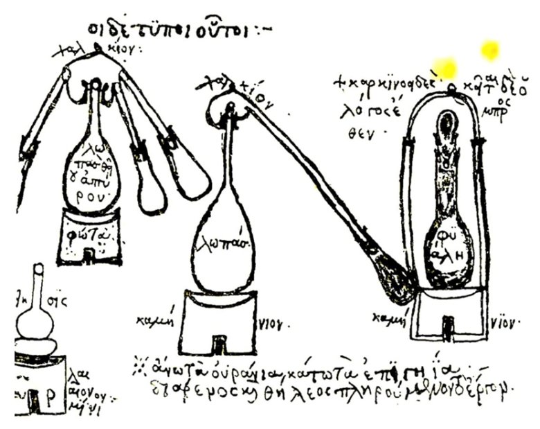 試圖改變物質以延長壽命或創造出人們渴望的物品,如黃金,推動了通過蒸餾進行分離這一技術的發展。簡單蒸餾是已知的最古老的方法之一,它根據沸騰液體混合物中組分揮發性的差異來分離混合物。加熱液體產生蒸汽,蒸汽隨后被捕獲并再次凝結,從而分離混合物的成分。這張圖片代表了 Zosimos 的早期蒸餾設備: