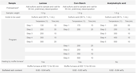 濕法灰化系統通過兩種儀器的完美同步工作,得到最準確的結果。在這項研究中,通過對一些樣品測試,如乳糖,玉米淀粉以及阿司匹林等。通過應用這些方法,測定的硫酸鹽灰分含量低至 0.02 - 0.04 wt% (如表1),很好的吻合于樣品的真值。