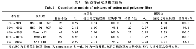 表1 中給出對棉/滌樣品所建立的 5 個模型的匯總結果。以按照 GB / T 2910. 11-2009 方法測定的樣品棉含量和模型預測棉含量的絕對 誤差為判定依據,若絕對誤差位于(-3%-3% ) 區間,認為樣品預測準確,反之,預測錯誤。對棉含量為 0~100% 的模型進行優化后,校正集和預測集的相關系數 Rc 和 Rp 雖然較高,但校正均方根誤差及預測均方根誤差( RMSEP) 較大,且對樣品的判定準確率低,預測集的準確率僅達 85.3% ,分段建模后預測準確率得到大大提高,可見,按棉含量不同分段建模,能更好地利用此含量范圍內樣品的特征,得到更好的效果。