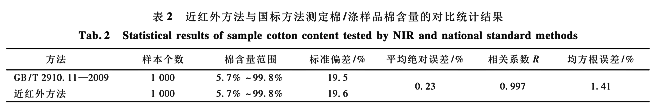 表2 示出近紅外光譜法和國標方法 1000 個棉/滌驗證樣品棉含量的對比統計結果。1000 個棉/滌樣品的預測結果為錯判 10 個準確率為 99%。對預測結果和國標方法得到的結果進行方差分析,置信區間為 95%,顯著性水平取 5%,F 比為 1.01,小于臨界值 1.26,因此 2 種方法的結果無顯著差異。