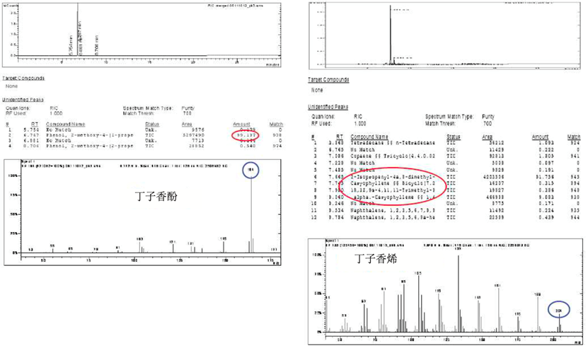▲ 圖2.采用 GC-MS 方式對分離得到的化合物1與化合物2進行鑒定,發現為丁子香酚(MW:164)和丁子香烯(MW:204),純度超過99%