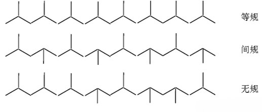 丙烯聚合成聚丙烯 PP,可以生成三種結構的 PP,分別是等 規PP、間規 PP 和無規 PP,如下圖。顧名思義,PP 等規度是指同一聚丙烯中等規的 PP 占 PP 總含量的百分數。