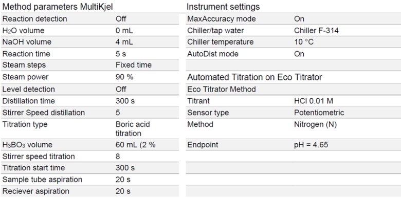 表1:用 MultiKjel 和 Eco 滴定儀進行蒸餾和滴定的參數。