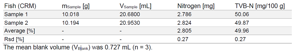 利用步琦凱氏定氮儀全自動進行測定魚類產品中的TVB-N可提供可靠和可重復的結果。結果與 52.49±5.35 mg/100g 的認證參考值吻合較好,相對標準偏差較小。