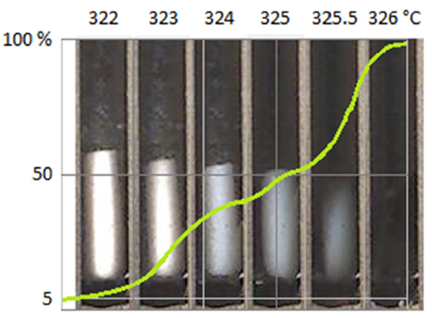 ▲ 圖1 所示。聚四氟乙烯的熔化過程。綠色曲線表示熔點軟件 Melting Point Monitor1.2 記錄的相應熔化等級。熔點范圍為 322.9±0.4°C ~ 326.0±0.1°C。
