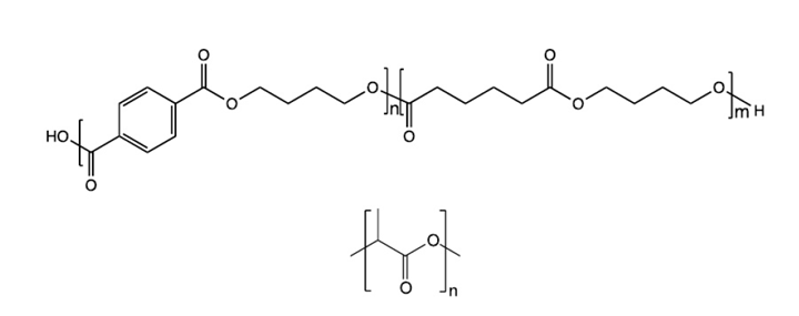 ▲ 圖1:聚對苯二甲酸丁二酸酯(PBAT)(上)和聚乳酸(PLA)(下)的結構式