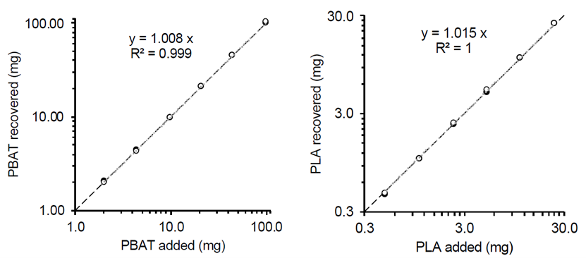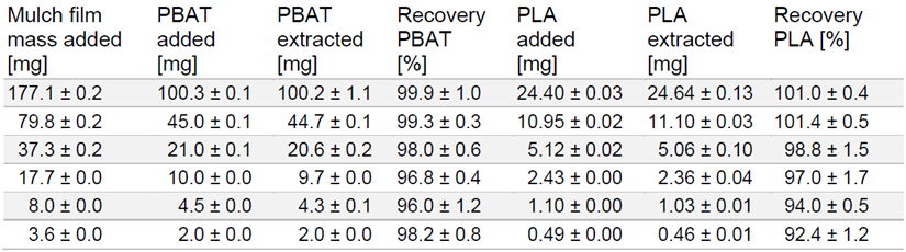 PBAT 和 PLA 的回收率都在可接受的范圍內,PLA 從 92% 到 101%,PBAT 的平均回收率為 100.8%,PLA 的平均回收率為 101.5%,這些結果表明,PBAT 和 PLA 都是定量提取,而不需要對提取物進行純化(即土壤中的有機質對 PBAT 和 PLA 的干擾很小)。