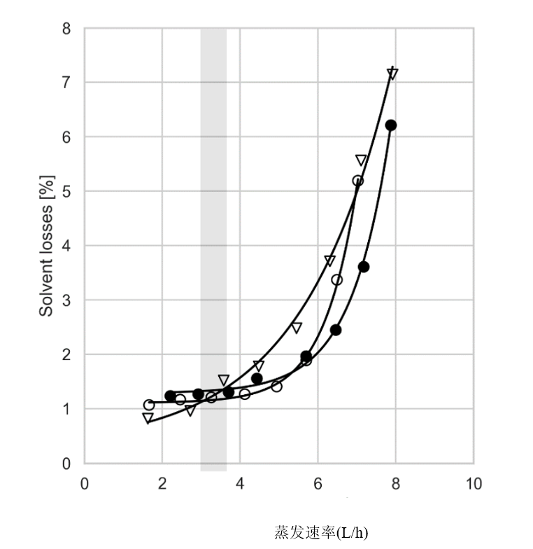 人們還應(yīng)該注意到,在設(shè)備的極限上使用并不總是明智的。為了高效、溫和和環(huán)保的蒸餾,建議根據(jù) Delta 20 規(guī)則選擇工藝參數(shù)[3]。對于給定的示例蒸餾,與這些參數(shù)對應(yīng)的區(qū)域在 圖2 中用灰色條表示。在該區(qū)域,所有冷凝器的性能都低于 2% 的溶劑損失閾值,并且只使用了可用冷卻表面的一小部分。
