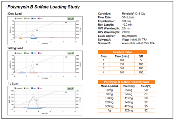 ▲ Polymyxin B 的快速純化載樣數據表明,上樣量可達分離柱質量的 0.1–10%,而對回收率沒有不利影響。