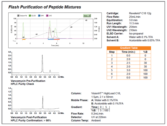 包含兩個多肽(萬古霉素和硫酸多粘菌素B)和一個小氨基酸(牛磺酸)的測試混合物證明了 Pure 快速純化系統能夠充分分離肽混合物的能力。結果表明,使用 60?,40μm C18 介質進行快速純化可充分分離出三種具有對稱峰形的化合物。UHPLC證實了萬古霉素和硫酸多粘菌素B的純度均高于 98%。混合物在10分鐘內純化,這比使用制備型 HPLC 純化相同混合物快約4倍。除此之外,結合了 UV 和 ELSD 雙檢測器系統的另一個好處是,可以檢測和收集未反應的氨基酸片段和無紫外吸收產物。以此為例,牛磺酸僅被 ELSD 檢測到。