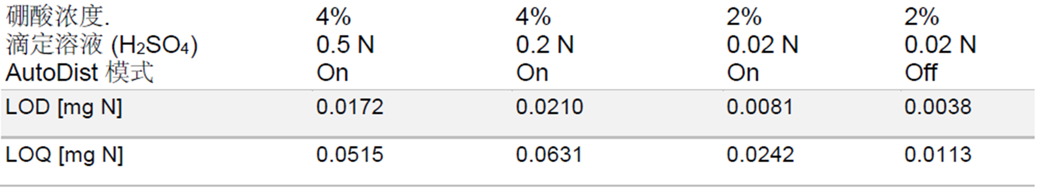 在此,對(duì)于低氮含量,發(fā)現(xiàn)其檢測(cè)限(LOD)和定量限(LOQ)均低于 0.1 mg N,表現(xiàn)優(yōu)異。通過使用 2% 硼酸溶液與 0.02 N 硫酸,獲得了最佳結(jié)果,檢測(cè)限為 0.004 mg N,定量限為 0.01 mg N。對(duì)于高氮含量(> 6.75 mg N)的情況,建議使用 4% 的硼酸溶液。[2] 盡管這種溶液會(huì)導(dǎo)致檢測(cè)限(LOD)和定量限(LOQ)值升高,但由于氮含量增加,總體影響會(huì)有所降低。